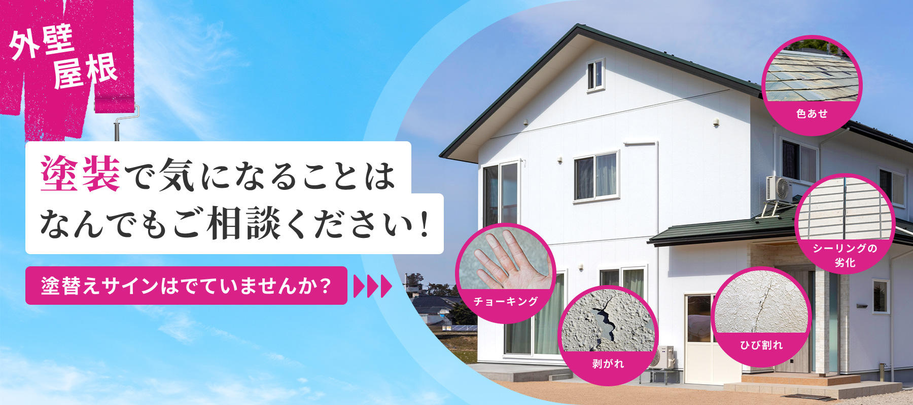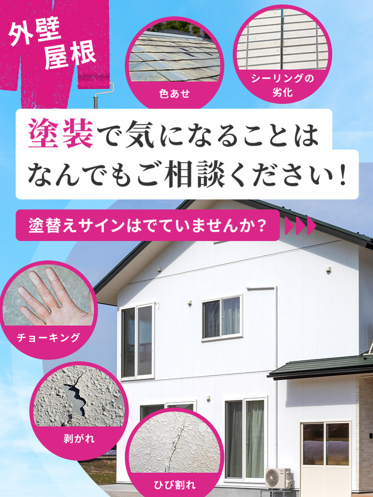 そのお悩み、実は外壁塗装が必要なサインかもしれません。そこで一度、当方にご相談ください。外壁や屋根の状態をしっかりとチェックし、本当に塗装工事が必要か判断いたします。お見積りは無料です。